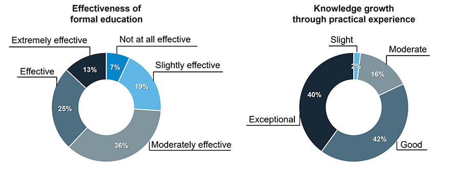 Another strong message from the survey is that tailings expertise is built primarily through practice. Respondents generally felt that formal education provides a foundation, but most learning occurs once professionals enter the field through on-site project experience, office-based analytical work, and mentorship from more experienced colleagues. Short courses and workshops play an important supplementary role but are most effective when paired with real project exposure.