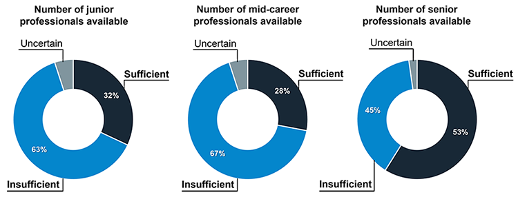 - Two-thirds of respondents report insufficient staffing at junior and mid-career levels.