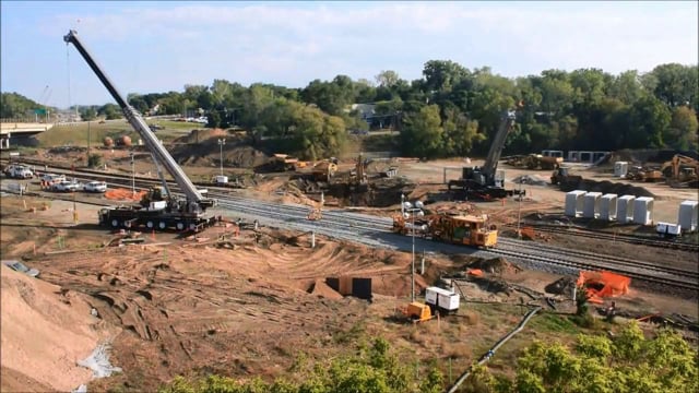 Barr helped the Capitol Region Watershed District realign a section of the 100-year-old Trout Brook interceptor to make way for new Minnesota Department of Transportation highway bridges near downtown Saint Paul. BNSF Railway agreed to a rare 30-hour shutdown of two mainline tracks to allow removal and replacement of 120 feet of track, open-cut excavation, installation of 162 feet of box culvert, and backfilling. Months of planning preceded the effort. We designed a three-tiered diversion and dewatering system to accommodate lower base flows so that the stream could handle higher flows to prevent flash flooding. Challenging soil conditions, a high groundwater table, and contaminated soils and groundwater complicated site design and construction. A sophisticated track-monitoring system was installed to verify that the surrounding railway was not impacted.